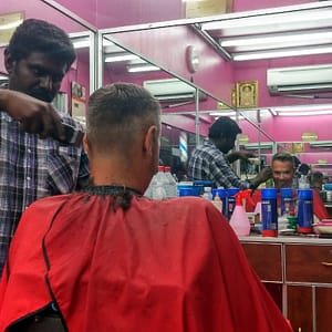 Zastavíme sa ešte na večerné strihanie u Inda, kde reve hudba a zvuk k filmu, ktorý spolu so zákazníkom v McDonnald uniforme pozerajú na telefóne odpočívajúcom na pulte pred zrkadlo. Chalanko z Mekesu nahodil drsnú britvovú vizáž. Už keď sme prišli k holičovi vyzeral byť hotový, no strihač sa s ním ešte riadne vyhral. Britvou mu potom zvýraznil kontúry celého skalpu, len na spodu krku mu nechal prechod. Keď už to mal v ruke tak mu vyholil fajnú bradu – komplikovanú ako bludisko zvrchu. S mojím sivým páperím mal oproti tomu oveľa menej trápenia. Fajne ma vyšmákal za ani nie 5 minút a to ešte použil aj britvu.