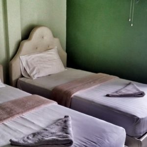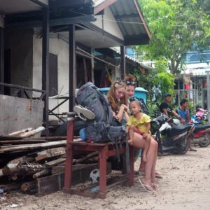 Keď výjdeme pred hotel, zľahka sa rozprší. Kým prídeme na zastávku, sme už celkom mokrí. Nakladajú nás do minivanu, kde fučí klíma naplno a my len dúfame, že neprechladneme. Dlhá klimatizovaná cesta končí fiaskom, keď nás šofér vyhodí pred rozhodným predajcom lístkov. Ten je nespokojný, že sa v navigoške pokúšame čosi zistiť, tak nám volá kohosi anglicky hovoriaceho a silou mocou nás len zkasírovať. Loď stála 600B, bus do prístavu 100B a to ešte začal tým, že nás taxík odvezie pol hodinu. Anglicky hovoriacemu moc nerozumiem a ani ma nezaujíma. Celé je to nejaké pofidérne. Z navigácie zistíme, že stanica je len 400 metrov od nás a tak nakladáme vaky a ideme tam. Tam by mali byť dve predajne lístkov. Ideme po ulici a zrazu okolo frčí dedko predajca aj s belochom – čo s nami prišiel v minibuse. Kričí, že ok, ideme na stanicu.