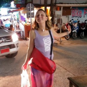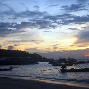 Ráno čakáme s francúzskym párikom a domácou pred hotelom. Ja odmietam stáť na ulici, tak si podriemkávam posediačky vo vnútri. Zdrazu domáca zvrieskne bus a my sa v panike rozbehneme temnou uličkou na hlavnú. Tam je veľký bus plný turistov z Bangkoku. Zdá sa mi, že sa nevezieme ani 20 minút a sme v prístave. Prestupujeme na loď. Veľký vak hádžem na kopu ale v malom je kompík, tak ho tam nechceme nechať. Oni nás ale s vakom nechcú pustiť do kajuty. Tak chvíľu posedávame vonku, a do lode vôjdeme o poschodie vyššie. Nechcem riskovať morskú nemoc, a tak radšej schádzame do najnižšej úrovne. Je tam niekoľko stovák sedadiel a všetko je to prázdne. Tak sa vyvalím a pospávam celé tri hodiny. K pozerá niečo v telke a podchvíľou sa pochechtne.