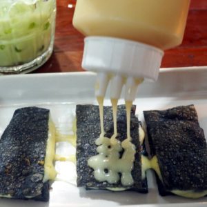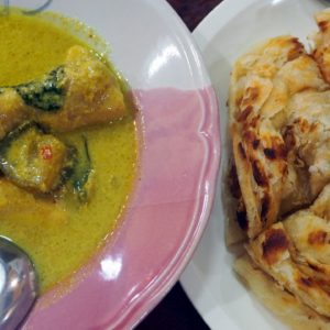 Tak keď sme mäkkí na krabov, dáme si aspoň prvú moslimskú baštu. Karí s plackovým chlebom je fajn, ale čierna palacinka plnená čerstvým syrom a polievaná salkom je skutočná bašta. Aspoň že nám servírka v šatke poradila, že sa to má zalievať tým salkom. Celé to – keďže pivo tu neservírujú – splachujeme lahodným frapé zo zeleného čaju a mlieka.