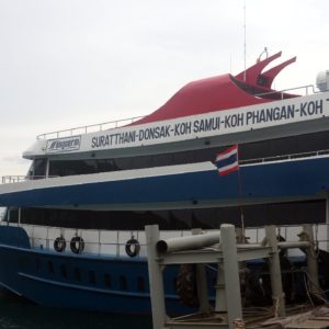 Na stanici vidíme len stánok drahšej spoločnosti a tak zamierime do informácií. Tam už zpoza nás dedko čosi kričí na korpulentnú paničku a nám začína byť jasné, že to nie sú naozajstné informácie, ale zase len predajca lístkov. Navyše pani drží tú istú líniu ako dedko. Rozhodneme sa teda, že ostávame na noc a ušetríme stovku za loď a stovku za bus na hlavu. Loď lacnejšej spoločnosti Songserm vyráža z prístavu neďaleko o 07:00, o šiestej sa vyráža busom z mesta. Tranzit je v cene. Vyzdvihnú nás na hoteli.