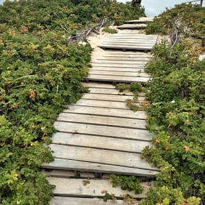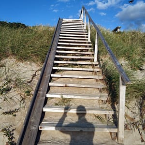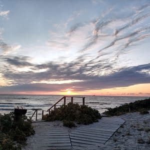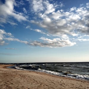 Čisto plážový deň 03.08. využívame naplno. Na poobednú kávičku končíme v bare na dune. Čašníčka je zlatá, zapojí nám aj predlžovačku a môžeme sa dobiť. Náš lokálny internet tu má dobré pokrytie. Na večer robíme run do obchodu v Juodkranté. Je treba premazať reťaze, už včera riadne škrípali. Cez kopec tam a späť je to len 4,13km. Vlny na bežne plochom mori sú dnes večer pri západe masívne.