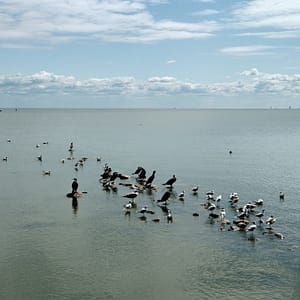 Od rána 01.08. visí dážď z ťažkých oblakov za nohy. Podľa predpovede má okolo 14h pršať, tak po plážových aktivitách volíme okruhovú cestu (11km) do Juodkranté. Nový asfaltík spred dvoch rokov začína v cyklo časti chátrať, fakt škoda. Mám dosť vyšľapať kopec cez dunu. Zastavujeme sa na vyhliadke na hniezdisko kormoránov (6500 hniezd), obloha je celkom sivá, ale dáva pekné pozadie hniezdam a ich obyvateľom. U babky kupujeme typickú údenú rybu a v lokálnom minimarkete pod kopcom čarodejníc čierny chlieb a pivo. Piknikujeme s výhľadom na záliv a tesne pred dažďom parkujeme v hipsterskej kaviarni-reštaurácii. Dážď neustáva, tak pracujeme pri káve a vegánskom dezerte až do večere, keď nám čašník ponúkne extra zubáča. Pesto k nemu a aj šalát sú lahodné. Keď príde ešte raz, že má ešte jednu extra rybu, zdá sa mi, že by sme boli prejedení, tak ju na Tvoje sklamanie odmietam rybu s 50 percentnou zľavou. Pozorujeme západ a prvý krát sa dnes večer nekúpeme.