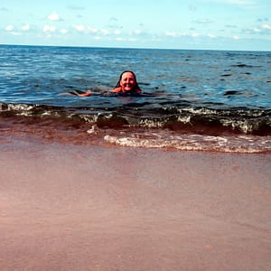 Posledné ráno 05.08. nás víta slnko. Vyrazíme pred odchodom ešte raz do Juodkranté, tento krát v opačnom smere (11,23km). Konečne mám správne svetlo aj vo fotogenických bažinách. Posledný krát sa kúpeme. Plavčík nás príde upozorniť, že plávať sa može len po bójky, čo je fakt, že kúsok od brehu. Ale že chodiť sa vo vode môže neobmedzene. Haluz. Nabíjame sa na našom solárnom stĺpe pre prezliekacej kabínke s reklamami na nealko nápoje. Musí sa uznať, že taký výber nealka piva, vína a iných bežne alkoholických nápojov sme jakživ nikde nevideli. Po domácich cestovinách na pláži vyrážame na trajekt.