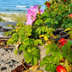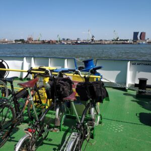 Trajekt späť (1E za oboch) zmeškáme o chlp, tak aspoň vyskúšame solárny wifi stojan integrovaný so samoopravou bicyklov. Z najväčšej lode zo sťažnov revú unifikovane piesne kolumbíjsky námorníci, keď teatrálne odchádzajú z Klaipédy. Večeriame v príjemnej záhradke už na Kose v Smiltyné. Na našu pláž prichádzame na kúpanie v západe. Je stále teplo, na páperky to nevyzerá.