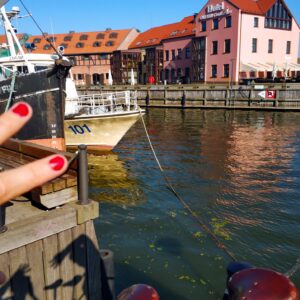 Trajektom (1E na hlavu, bicykel zadarmo) sme za chvíľu na druhej strane, priamo medzi stánkami s údenými rybami, pivom, lokálnymi výrobkami a hordami turistov. Teplota na dispeji hlási neuveriteľných 31 stupňov.