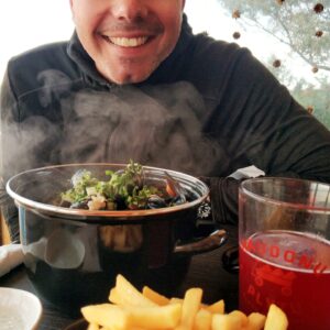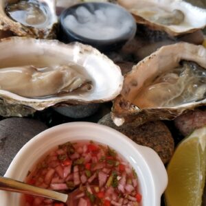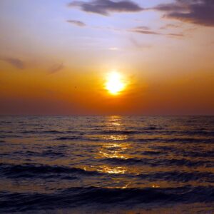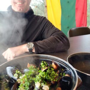 Dnes 04.08. je fakt krásne. Je to náš posledný plný deň na kose. Po domácom obede sa poobede prevezieme klasickým okruhom (10,96km) do Juodkranté. Kaviareň-pekáreň nájdeme prvý krát otvorenú, ostávame tu pracovať do záverečnej 18 hodiny. Večeru berieme v romantickom štýle v našom podniku na dune. K pivu z červenj repy si objednávame štvoricu ustríc a hrniec mušlí. Tá kombinácia smotanovej omáčky s kuriatkami (hubami) na víne je z iného sveta. V zbytku omáčky utopíme hranolky, je z toho delikátna hranolková polievčička.Západ v mrholení mesklame.