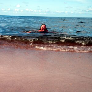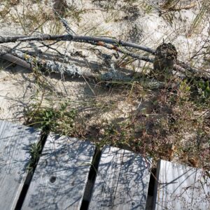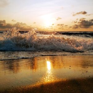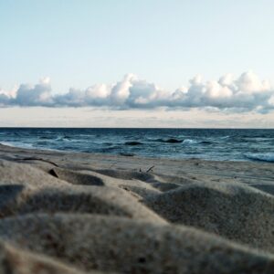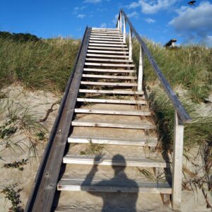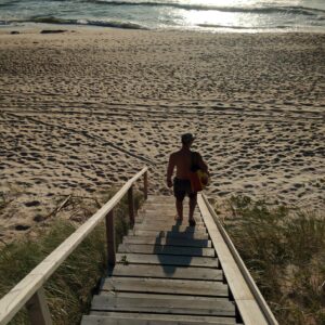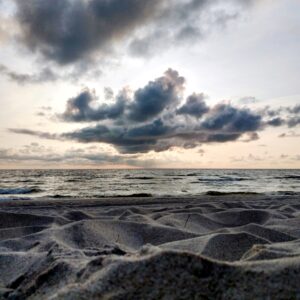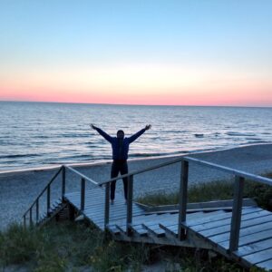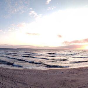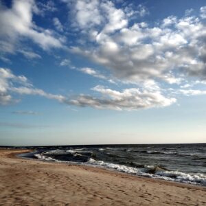 Čisto plážový deň 03.08. využívame naplno. Na poobednú kávičku končíme v bare na dune. Čašníčka je zlatá, zapojí nám aj predlžovačku a môžeme sa dobiť. Náš lokálny internet tu má dobré pokrytie. Na večer robíme run do obchodu v Juodkranté. Je treba premazať reťaze, už včera riadne škrípali. Cez kopec tam a späť je to len 4,13km. Vlny na bežne plochom mori sú dnes večer pri západe masívne.