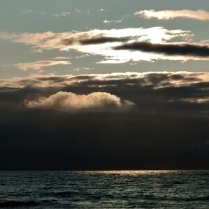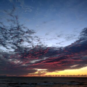 V supermarkete v centre mesta je nátresk, ale podarí sa nám vrátiť všetky vratné fľaše. Doma na pláži večeriame domáce rizotko a obzeráme bizardné stádo oblakov.
