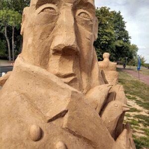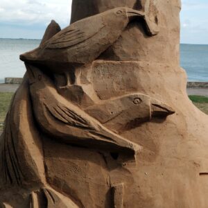 V parku na brehu zálivu je nová expozícia pieskových sôch. Ktovie s čím ten piesok miešajú, že to takto dlho drží tvar. Náš z minulosti obľúbený podnik je úplne plný aj s dlhou čakacou šórou, tak končíme v hisperskej kaviarňo-reštaurácii. Jemne sa rozprší a keď sa uvoľní miesto vo vnútri pracujeme na elektrike do večera. Cestou domov obzeráme známe udiarne rýb a obľúbené súsošie oviec. Na večer je slnečno, ale prvý krát ideme z plaviek do páperky. Poobedný dážď doniesol definitívne ochladenie.
