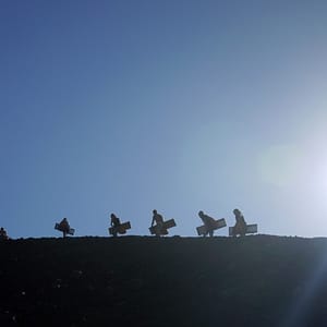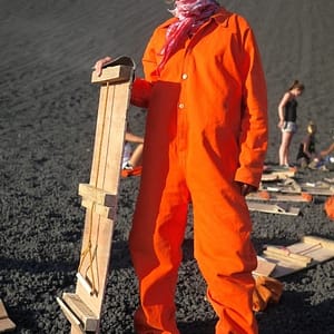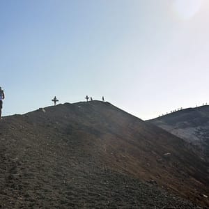Popadneme boardy (asi 5mm hrubé preglejky podbité oceľou, na začiatku je polka rúry ako nárazník, na konci je zvrchu prípravok na sedenie a zospodu už spomínaný plast na zlepšenie manévrovacích schopností), vaky s overalmi a vodou a poďho na sopku. Šlapeme za sebou ako húsky, občas vedúca zavelí prestávku, za čo sme jej každou ďalšou vďačnejší. Po najdrsnejšom (najstrmšom) úseku je dlhá pauza na fotenie sa na skale s výhľadom. My sme sa už ale počas predchádzajúcich zastávok prepracovali do konca pelotónu a nemáme ani síl na rozdávanie, tak len kukáme čo vyvádzajú iní, a dopíjame zvyšky našej vody. Tu už fajne fučí, tak nesiem board na zadku naklonený tak, aby ma vietor tlačil. Keď však nad skalou zmeníme smer, musím už board niesť vodorovne a chytať vietor tak, aby ho nadnášal. Keď sa mi to darí, board skoro vôbec nič neváži. Na hrebeni je ale vietor už taký silný, že ho neviem skrotiť a len si dávam pozor, aby ma nesfúkol. Sú pekné výhľady naokolo a do „krátera“ kde pofukujú kadejaké výpary a tak beriem aj Katkin board, nech si môže fotiť. V tom momente sme predposlední. A baby, ktoré sme vyhodnotili ako Izrealky majú vážne problémy, a preto mi príde ftipné, keď ma jedna z nich veľkodušne púšťa pred seba. Zvyšok pelotónu sa vzďaľuje, ale už vidím koniec, tak si hovorím, že to nejako vydržím. Skúšam sa opierať bordmi o vietor, ale ten je premenlivý a hrozí, že spadnem keď prestane. Potom zase príde a hodí ma do druhej strany. V jednom takomto údere nie som dosť pevne uzemnený a padám lakťom naoba boardy. Celkom to bolí, a uvažujem, že zostanem chvíľku len tak ležať a oddychovať, ale chcem už byť v závetrí a bez boardov v ruke, tak vstávam a šlapem ďalej. Keď konečne dorazím k ostatným, hodím boardy do škvary a oddychujem, a čakám na Katku bez síl ísť jej v ústrety. Keď sme všetci začneme sa obliekať a konečne pochopím, prečo mali americké surferky podkolienky – je to ideálny spôsob, ako zabezpečiť aby sa im do nohavíc overalov nedostala škvara z brzdenia. Všetky taktiež majú šatky cez nos, dobré proti prachu z brzdenia. Všetci sme oblečení a vedúca nám ukazuje ako sa jazdí. Pozerám sa dole kopcom, pod nami je preparkovaná tatrovka a vyzerá to prekliate strmo. Vôbec sa mi nezdá, že to bol dobrý nápad prísť sem hore a skúšať to zjazdiť. Ukľudnujem sa, že keď to už toľko ľudí zvládlo, tak tohádam zvládnem aj ja. Mám predsa aj nejaký ten tréning na snehu, a pred rokom som sa naposledy boboval na asi 20 metrovom svahu. Tento má pekných pár stovák, a škvara vôbec nevyzerátak mäkkúčko ako sneh. Jediné čo ma odrádza od zídenia svahu po vlastných je spomienka na strastiplné nesenie boardu cez vietor. Po inštruktáži boardovania tam už naše boardy nie sú, niekto iný si ich zobral, tak beriem nejaký, ktorý mi po pár sekundách berie nejaký otravný pako, že to je jeho, že on mal ružovú šnúrku. Čistý gejlord. Beriem si teda iný a zoraďujem sa na koniec, aby som mal možnosť poučiť sa z chýb predchodcov. Sme na konci, po nás sú len tri Izrealky s čierno nalakovanými nechtami na rukách. Sú dva štarty 5 metrov od seba a vedúca púšta na striedačku raz jeden, raz druhý. Katka vyráža zo vzdialenejšieho, a ja usadám na svoj, takže ju moc nevidím. Keď vedúca odmáva mňa okamžite štartujem, čo sa neskôr ukáže ako chyba. Ide to celkom svižne, snažím sa moc nebrzdiť, lebo z toholieta škvara, ale aj tak ma začne nejako vytáčať a zošuchávať z boardu. Snažím sa to nejako decentne ubrziť aby som sa znova vycentroval a nakoniec sa mi to podarí už s polkou zadku na škvare. Je mi teraz jasné, prečo má toľko overalov predraté zadky. Vycentrujem sa a frčím ďalej, teraz lieta okolo a do mojich rúk o poznanie viac škvary a čo je najhoršie, vyzerá to tak, že dobieham ženskú, čo štartovala predomnou. Musím teda brzdiť a to predstavuje hneď dva problémy. Jednak budem mať zlú nameranú rýchlost (dole šofér tatrovky metria policajným merákom ľudí rútiacich sa na neho), a druhak brzdenie vnášalo do smeru jazdy dodatočnú neurčitosť (krútilo to na stranu ak sa nebrzdilo symetricky). Do tretice som ešte nadobudol pocit, že radšej trošku zahnem ako budem brzdiť lebo aj tak to neubrzdím. Nakoniec sa ale nič strašného nestalo (ak nepočítam moju mizernú rýchlost 32km/hr), zostal som stáť na ešte nie uplnej rovinke sám od seba, a ešte som musel 5 metrov board tahať ku tatrovke. Tam už vedúca chladivým sprejom ošetrovala odreniny vyklopených expertov, ku ktorým sa na moje veľké počudovanie radila aj Katka. Keďže sa obetovala a dala si moj krátky a široký overall, do toho sa ešte aj vyklopila tak, že sa jej tento vyhrnul a oškrabala si aj ruku aj nohu. Je to proste kaskadérka. Ako náplasť jej slúžilo, to, že to ako 3 zo 6 fotiek dotiahla na Facebook BigFootu. Wipeout ako vymaľovaný. Niektorí ľudia su pekne zaprášený na tvári, jedna Izrealka vyzerá ako by mala bradu ako George Michael. Celkom ftipné. Dostávame každý chladené pivo, ktoré poučený pijem expresne pred tým ako naskočíme na korbu náklaďáku, na korbe dostaneme koláčiky a trmácame sa naspať. Nikto nechce ísť na WC pri budove parku, okrem jednej surferky, ktorá na naše nabádanie vyskakuje priamo z korby, lebo cez napchatú posádku by sa neprepchala. Nanešťastie dopadne na kostrč, a tak si do konca cesty pridŕža na zadku zamrznutú fľašu vody. Cesta naspať je iná, často oproti nám idú volky alebo náklaďaky spojené so školskými autobusmi. Občas musíme cúvať, konáre ale stále búchaú po hánkach, alebo po hlavách baby čo sedia. Mám ale trochu lepši pozíciu a tak je cesta naspäť predsalen o čosi kratšia. Na hosteli nás vítajú free mojitom, ku