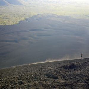 Ráno zožerie internet v Katkinej snahe kúpiť spiatočné letenky. Tie totiž medzičasom už zdraželi o 50EUR každá a to sa nám vôbec nepáči. Zakaždým, keď však Katka stlačí tlačítko zaplatiť, chcípne internet a ona začína celý cyklus odzačiatku. Na internet a neskoré raňajky/skorý obed sa dostávame do BigFoot, kde majú akciu na kapučíno a tak kupujeme lístok nad kávou a nakoniec, keďže je už po 11h00 objednávame si aj mojito. Stretávam sa s chalanmi zo včera, ktorí sa tu ubytovali. Rozhodneme sa pridať k 3om z nich na volcano boarding. Obed vo Via Via si musíme nechať zabaliť, lebo sa obávame, že by sme to na 13stu nestihli a to i napriek tomu, že Katka urobí run a donesie košeľe a krém proti slnku a pevnú obuv, ktorú na výstup na sopku potrebujeme. Zabalené jedlo potom jedno zjeme kým čakáme ½ hodinu na štart a druhé jedlo odložíme spolu s notbukom na recepciu Bigfootu. Ten sa ukáže ako celkom pekný hostel, i keď dormy boli poschodové a celkovo dosahovali až tri postele nad sebou v jednej miestnosti. To sa mi zdalo ešte brutálnejšie ako v Amstri, kde boli dvojposchodové dvojpostele. Majú tam dokonca aj malý bazénik v tvare Bigfootu (veľkej nohy) a ratanové hamaky, niečo, čo som ešte nikdy nevidela musel som preto automaticky oskúšať. Vedúca zájazdu nás vyzýva, aby sme pustili nižších ľudí sedieť, lebo tí nedočíahnu na držadlá, ak by mali stáť. Keď konečne vyrazíme je nás plná tatrovka, ženy ktoré sa zdajú byť v prevahe sedia po stranách a chlapi stoja v strede. Keď výdeme z mesta na prašnú cestu zostaneme stáť a vedúca hlási, že si môžeme kúpiť pivo. Pridávame sa teda, no plechovkové pivo dojde, tak idú kúpiť basu fľaškového. Popíjam jednou rukou, pridŕžam sa druhou rukou. Na prašnej ceste skáčeme tak, že ma po chvíli začne ruka na trubkách bolieť a začnem piť pivo oveľa intenzívnejšie, aby som mal obe ruky na držanie. Lietam v tatrovke (vlastne je to mercedes, ale vyzerá ako tatrovka) lietam ako špinavé prádlo a sem tam sa na nás celkom práši. Cesta sa zužuje a miestami je nad nami toľko konárov, že mi švihajú po hánkach prstov. Celkom to bolí, tak sa chytám na miesta, kde je ešte nepredratá plachtovina a začnem sledovania konárov pred nami venovať oveľa väčšiu pozornosť. Cesta vedie rovinkou cez ranče/chatrče/polia vybudované na čiernej sopečnej zemi. Tá vyzerá byť suchá a zrejme na nej nerastie nič, čo nie je extrémne odolné alebo polievané. Pestujú tu cukrovú trstinu, banány, kukuricu. Občas vidno pobehovať čierne chlpaté prasiatka s golierom z konárov do X, aby nedokázali preliezť cez ploty tvorené dvojicou alebo trojicou ostnatých drôtov. Na prepravu sa používajú kôňmi alebo volmi ťahané vozy. Je to dosť rustikálne. V diaľke sa približujú sopky a ja už nemôžem vydržať, kedy tam budeme. Sediace baby sa celkom vykecávajú, a my stojaci sme radi, že sme. Nakoniec zastavujeme pri dome, ktorý vyberá $5 na hlavu za vstup do národného parku. Veľa ľudí taktiež využíva možnosť vypustiť pivo. Keď je už všetko vybavené, čo pri 40 ľudoch celkom dlho trvá, nastupujeme znova a trmácame sa ešte asi 10 minút na maličké parkovisko pod sopkou, z ktorého vedú už len pešie cestičky. Vyskakujeme s oranžovými kapsami s našimi overalmi, fasujeme ochranné okuliare a boardy. Tie majú čerstvo nalepené plastové plochy pod zadkom na optimálne šúchanie a vedúca nás upozorňuje, aby sme ich moc nevystavovali slnku, lebo sa zošuchnú. Obliekam si košeľu, aby som si nemusel natierať ruky opaľovacím krémom sú tri poobede ale je ešte stále teplo, klobúk som si kvôli veternosti navrchu nechal v kabíne tatrovky a tak mi Katka z košele robí turban. Turban sa nakoniec ukáže ako super vec, lebo mi hore nefučí do uší, nepečie na hlavu a som čistý keď zídem dole. Niektorí majú celkom pekné brady od prachu, hlavne tí čo moc brzdili. Katka má večer v sprche úplne čierne uši.