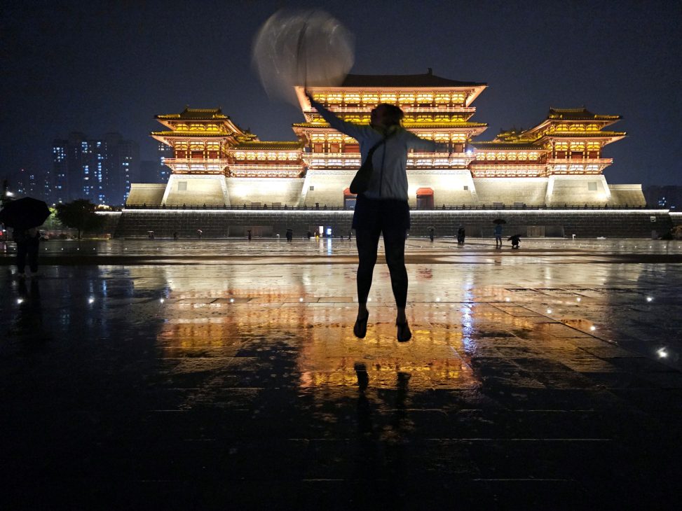Ideme na neďaleké námestie a dávame si dažďové fotenie. Palácový komplex na námestí vyzerá ako v Thajsku. Potom sa prejdeme na megaveľké čínske burgre, už nám spravia dva. K sa zdá, že pár vyzerá mongolsky. Babka tam má manžela a ten teraz robí brugre. Babka mu len všetko seká. Sú minimálne tak dobre, ako ten obedný. Pán si nás potom natáča na čínsky IG.