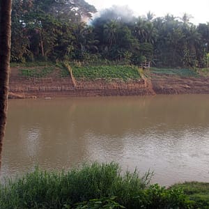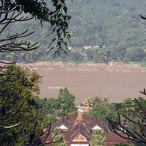 Na velikom brehu je zopár lodiek a už aj zablúdení cyklisti. Ideme rovno k polonaloženej loďke (dosť plytkej), ktorej kapi veselo telefonuje. Keď dovolá dám mu lístky a ideme. Cesta cez rieku nám úplne stačí, zase raz nemáme ochranu na elektroniku, tak snáď nebude žiadne neplánované kúpanie v Mekongu. Normálne sa do tejto jaskyne chodí z mesta loďkou, dve hodky proti prúdu, jedna naspäť. Tento preplav má ale pekný výhľad a čučat na to dve hodky by asi bolo nudné.