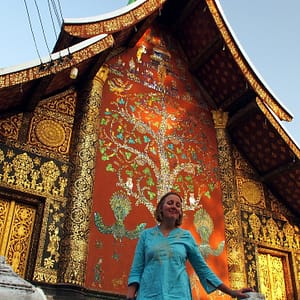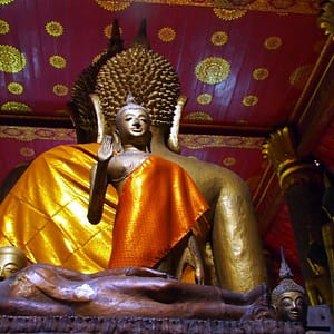 Zostáva nám už len hlavný chrám (Wat Xieng Thong, 20000K každý). Čuduj sa svete, dnes nie je ani také fajné svetlo ako včera. Je chladnejšie a sme uťahaní. Mali sme tam my ťupíci predsa len včera ísť. Rozdeliť chrámy na viac dní. Chrám je úplne parádny, rôzne farebné budovy, na nich mozaiky zo skla, ktoré sa trblietajú na zapadajúcom slnku. Všade je kopec zlata. Jeden turista nám ukazuje obálku LP a na nej fotku mních zatvárajúceho ružovú budovu. Tak sa tam o 106 fotíme, až nás nejaká sprievodkyňa zvozí. Ani nevieme prečo. Skúšame to aj pred zlatou budovou s pohrebným vozom, sú tam ale mraky turistov.