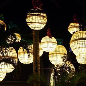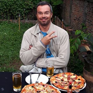 Dnes chceme okoštovať najlepšiu pizzu v meste (#1 podnik podľa TA), tak ideme cez bambusový most (mýto 5000K/os) na druhú stranu Nam Khan. Tam jednoducho nájdeme príjemný podnik. Pizza je veľmi dobrá, poriadne sa napcháme. Keď sa zotmie zapália romantické fakle. Je to vítaná zmena po nudliach a zákuskoch.