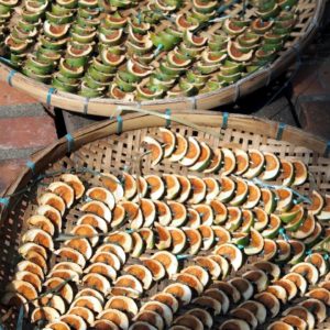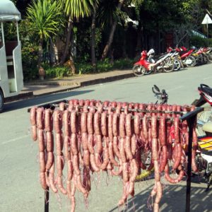 Ideme sa konečne najesť. Obligátna polievočka je doplnená ryžou (5000K) a kuracím prsom z grilu (10000K). Ryža je v mikroténovom sáčku ale prso aj s paličkou (prvý krát nám dali aj grilovacie drievko) je v banánovom liste a až potom v sáčku. Berieme si to so sebou ako proviant. Cestou naspäť zbadáme prasiatko v prútenej klieke na mieru. Leží a je opletené a ako dýcha celá tá klietka sa hýbe s ním. Ani nohy mu nevidno. Chúďatko ukvičané.