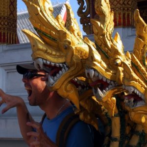 Večer ešte na izbe študujeme kam sa vyberieme ďalej. K objaví cestopisy nejakého Čecha, tak sa v salvách rehoceme na jeho príbehoch. Až očakávame, že každú chvíľku k nám niekto vtrhne a vyhubuje nám, že robíme prílišný hluk. Silne odporúčame, i keď sme nakoniec po jeho stopách nešli. <http:/www.miras.cz/cestovani/thajsko → laos → 06.php>