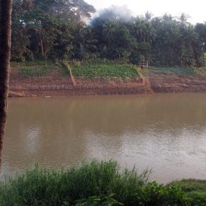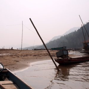 Na velikom brehu je zopár lodiek a už aj zablúdení cyklisti. Ideme rovno k polonaloženej loďke (dosť plytkej), ktorej kapi veselo telefonuje. Keď dovolá dám mu lístky a ideme. Cesta cez rieku nám úplne stačí, zase raz nemáme ochranu na elektroniku, tak snáď nebude žiadne neplánované kúpanie v Mekongu. Normálne sa do tejto jaskyne chodí z mesta loďkou, dve hodky proti prúdu, jedna naspäť. Tento preplav má ale pekný výhľad a čučat na to dve hodky by asi bolo nudné.
