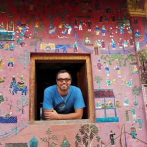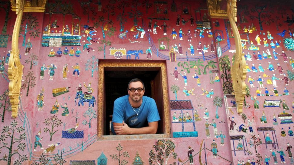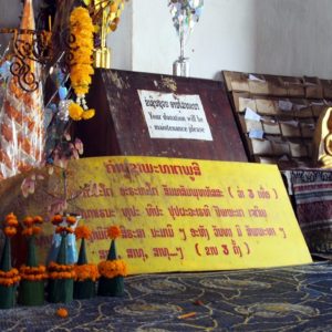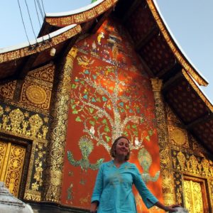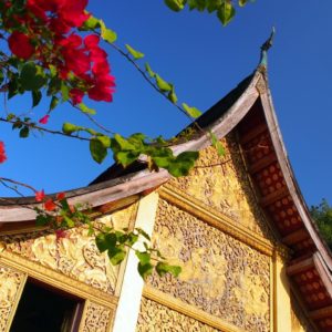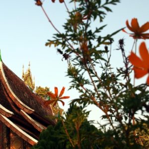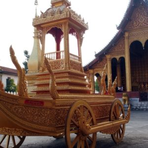 Zostáva nám už len hlavný chrám (Wat Xieng Thong, 20000K každý). Čuduj sa svete, dnes nie je ani také fajné svetlo ako včera. Je chladnejšie a sme uťahaní. Mali sme tam my ťupíci predsa len včera ísť. Rozdeliť chrámy na viac dní. Chrám je úplne parádny, rôzne farebné budovy, na nich mozaiky zo skla, ktoré sa trblietajú na zapadajúcom slnku. Všade je kopec zlata. Jeden turista nám ukazuje obálku LP a na nej fotku mních zatvárajúceho ružovú budovu. Tak sa tam o 106 fotíme, až nás nejaká sprievodkyňa zvozí. Ani nevieme prečo. Skúšame to aj pred zlatou budovou s pohrebným vozom, sú tam ale mraky turistov.
