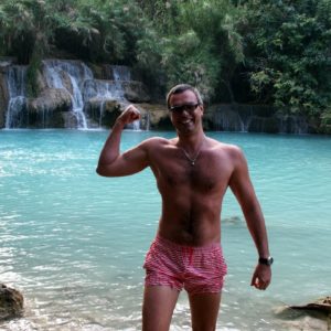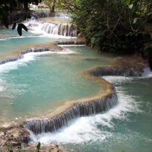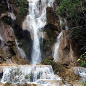 Frčíme ďalej, lebo chceme ešte vidieť vodopády, ktoré sú 30km od mesta na opačnú stranu. Popri ceste sa odohráva každodenný život. Najzaujímavejší je asi výjav z cesty pred nami, dvojica ide na motorke a spolujazdec ťahá za sebou fúrik – oboma rukami. Pri vchode do mesta vychytáme ten istý tenký most a ako pribrzdím na skokový nábeh strácame v nízkej rýchlosti na moste strabilitu a obaja sa ju pokúšame získať pokladaním nôh na cestu, čo končí tak, že sa dokopeme a ja vysoko intenzívne navigujem K aby si svoje nohy odložila a budeme používať iba jeden pár, môj. Za mostom si zastaneme, aby sme to predýchali. K je z intenzity mojej komunikácie trochu mrzutá. Inak sa pri prechode mestom riadime buzolkou a už nič zvláštneho nenastane. Vyberieme prachy v bankochmate a fičíme. Začíname nadobúdať pocit, že hodina je už dosť pokročilá, ale čo sa dá robiť. Snáď to stihneme. Je aj celkom chladno v tieňoch. Oproti ide veľa minibusov návštevníkov z vodopádov. Tých 30km nám po zákrutkách a kopčekoch trvá skoro hodinu. Sme aj celkom vyzimení. Strážca motoriek to už balí, je 16.30, no keď nás zbadá s radosťou nás ešte skasíruje (2000K), že vraj do 17.00 to ešte postráži. No mám strach. Zaplatíme lístky do vodopádov (20000K), tie sú otvorené do 17.30, takže by sme to mohli postíhať. Ideme okolo ohrady s medveďmi. Tie majú vodorovný zlatý mesiac pod krkom. Pred budovou sú sochy na porovnanie veľkostí všetkých známych medveďov. Panda je najvtipnejší, viď foto. Medvede sú všetky na kope pri budove, asi bude večera. 50 metrov od medveďov je prvý bazénik vytvorený vodopádmi. Sú v ňom aj malé deti. Ideme vyššie, bohvie koľko tam toho za celý deň načúrali. Vyššie je parádny veľký bazénik, peknej tyrkysovej vody množstvom pritekajúcich vodopádikov. Na boku sú prezliekárne a nich sa ozýva veselá vrava stredoškolákov. Idem sa prezliecť do práve opustenej kabínky a xvíľku si poplávam. Voda je studená a slnko slabé, netreba to preháňať. Pokračujeme hore, je tam ešte jeden kúpací bazén, potom už je kúpanie zakázané. Na konci je vysokánsky vodopád. Je to tu pekné, dalo by sa tu aj fajne piknikovať. Nikde už nikoho nie je, je to vyľudnené. Vyšlapeme si hore na vodopád, no 10minutový výšlap bol nadarmo,nič nevidíme a nemáme to ani čas moc skúmať, lebo o pár minút zatváraju. Fičíme strmým svahom dole. Brána je otvorená, nikde nikoho. Pred vchodom partička bielych turistov špekuluje, že pôjde dnu, i keď je už neskoro. Požujeme trochu ryže, dáme aj vetrovky a rukavice (ponožky) a frčíme dlhých 30km súmrakom a nakoniec aj tmou. Cestou vidíme nehodu, v dyme z nejakého plameňa máme aj problém navigovať. Náhodou trafíme na prvý krát do našej uličky a po 120km sme radi, že je to za nami. Asi dedkovmu synovi vrátime kľúčiky, motorku zatlačíme s jeho pomocou do dvora a hľadáme nejaké teplé miesto, že by sme naštudovali a naplánovali náš ďalší postup v Laose.