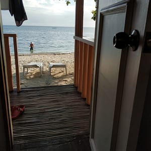 Nevieme, kam chceme ísť, tak sa necháme vyložiť v prístave. Týpci nás ale vyložia v úplne inom prístave ako sme si mysleli, že na pláži kam sme večer prišli. Tak sa podľa buzolky zorientujeme a cestou čekoujeme ceny ubytka a potápania. Ubytko je všade dosť drahé a dokonca na recepcii často drahšie ako na Agode. Kým prejdeme uličkami na hlavnú pláž máme dosť z tepla a uvažujeme, že skúsime preskupiť sily niekde v tieni s vyhliadkou jedla. Ako plán B sme mali vyhliadnutý Blue Corals rezort, kde sa spustili z P1800 na P1300 aj s raňajkami.