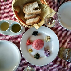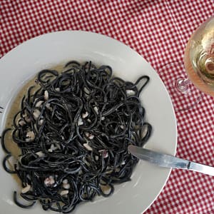 Čierne sépiové domáce cestoviny s kalamármi (biele kúsky sépie) sú fantastické. Ešte lepšie ako suprová pizza. Ideme sa zadrhnúť a musíme sa brzdiť, aby sme si to celé naráz nenapchali do úst, také je to dobré. V prestávkach k tomu pocuckávame z pollitrového džbániku a aj to rozlievané víno sa nám dnes zdá lepšie. Možno nám doliali z nejakej nedopitej fľaše. Ja si to kôli teplu a objemu nadstavujem ľadovou vodou a stále je fajn. Skoro ako v Chorvátsku.