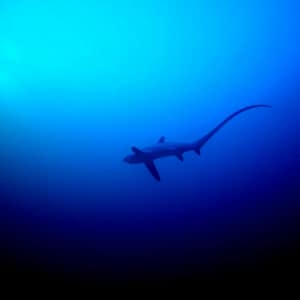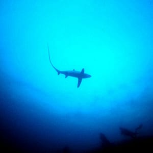 Všetko sa zmení, keď okolo nás poprvýkrát majestátne preplachtí threhser shark (žralok líščí). Je to magický zážitok. Hlavne asi tým extrémne dlhým chvostom a kovovo lesklým finišom ale aj veľkosťou sú zaujímavejšie ako bežné útesáky.