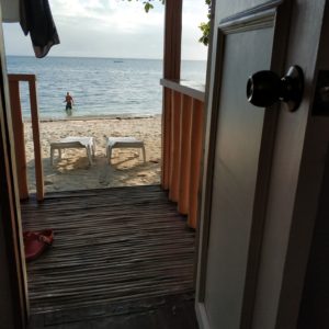 Nevieme, kam chceme ísť, tak sa necháme vyložiť v prístave. Týpci nás ale vyložia v úplne inom prístave ako sme si mysleli, že na pláži kam sme večer prišli. Tak sa podľa buzolky zorientujeme a cestou čekoujeme ceny ubytka a potápania. Ubytko je všade dosť drahé a dokonca na recepcii často drahšie ako na Agode. Kým prejdeme uličkami na hlavnú pláž máme dosť z tepla a uvažujeme, že skúsime preskupiť sily niekde v tieni s vyhliadkou jedla. Ako plán B sme mali vyhliadnutý Blue Corals rezort, kde sa spustili z P1800 na P1300 aj s raňajkami.