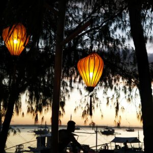 Už za tmy sa vyloďujeme na Malapascua. Pobrežie vyzerá pekne, hlavne vďaka lampiónom v plážovej reštaurácii. Trojkolky tu nemajú a nie sú tu ani motorky. Na tie by som sa aj tak bál ísť v tme, tak nám zostáva iba 1.6km šlapanica tmou a kalužami. Musíme vybrať aj čelovky, aby sme sa niekde nevymáchali. Odmenou sú nám nádherné hviezdy. Stresom sú motorky, ktoré nás niekedy míňaju v pekelne úzkych uličkách. Ideme podľa navigácie, no raz prepásneme odbočku a musíme sa vracať.