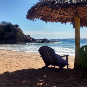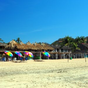 Presun do Huatulca je plynulý– colectivo do Pochutla. Tam prejdeme na stanicu minivanov a rovno nám naložia vaky do zadu a posadia nás vedľa šoféra. Pochutnávame si na kokose zo včera a 50km ubehne ako nič (2×27). Ubytko sme si bookli cez AirBnb. Prešlapeme tam cez milé mestečko, ktoré vyzerá ako na divokom západe. Domáci sú milí a ochotní. Od radosti z hladkého priebehu si dáme pivko a ideme do mesta. Cestou sa zastavíme na ceviche. Milé je, že všetky glutamanové omáčky sú extra, takže ich môžeme vynechať. Zbehneme na kyslú kávu do pekne vyzerajúcej kaviarne, kúpime Katke slnečné okuliare a obzeráme nenormálne drahé plavky. Potom sa vyberieme k moru. Cesta do zátoky je vybudovaná turistickou agentúrou. Predimenzovaná a prázdna. Na konci je pár hotelov a malá zátoka s prístavom pre megalode. Na malej plážičke je partia pripitých Američanov. Okúpeme sa, dáme si pivo a ideme naspäť.
