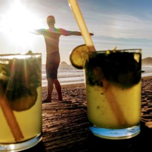 Večer je Hora Feliz na pláži, experimentujeme s malým mezcalom (20), tonikom a ginger ale (2×11). Máme ešte litrové poháre z minula, tak na skúšku zoberem polku vrecka s ľadom (10).