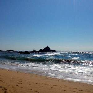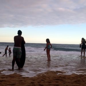 Po plávaní máme stále dobrý čas a západ sme dlho nevideli, lebo sme sa snažili v tom čase večerať, tak zbehneme do mesta nakúpiť na piknik a vrátime sa s jedlom na pláž. Rozložíme sa na dune-skale pri západe. Nie sú tu ani pieskové mušky. S poslednými lúčmi slnka idú dvaja harpúnisti a mávajú rukami vo vytržení, podľa pohybov je jasné, že stretli Katkinu mega raju.