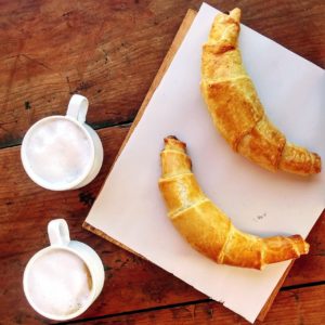 Na raňajky si dáme malé avokádko kúpené včera v meste s plackami z večere. Ako dezert vybehneme ku Talianovi na dve makiatká (2×20) a kornito (rožtek – akože kroasant – plnený čokoládou – 20). Pani má síce problém a chce za makiato 25, no vysvetlím jej to podľa cenník a odvtedy je to s ňou už ok. Rožtek chutí ako starkin koláčik. Veľmi dobrý. Káva s mliečnou penou dobre zapíše a preberie, takže na joge sme celkom svieži – nabústovaní.