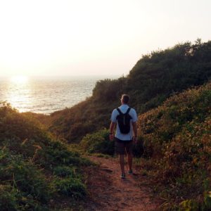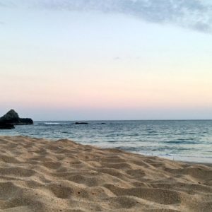 Západ sa moc nevydarí, je tam veľa oblakov, ale aj tak je tu pekne. A ani tu nie je žiadna štípajúca háveď ako sme čítali online. Dole na boku je pláž, zopár ľudí sa hojdá na vlnách ako slnko zapadá.