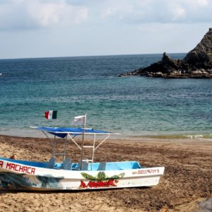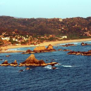 Skončíme v prvom voľnom hoteli za 400ky a zbehnem po pivko, od radosti, že sme ubytovaní. Zase majú akciu, tak kupujem dve (2×1.2L za 56). To druhé mi nechcú nechať v chladničke, tak si ho nechám odložiť na hoteli, že keď pôjdeme na pláž. Pivo vypijeme a ešte je dosť zavčasu na pláž, tak skúsime náš prvý mezcal (0,5L za 120). Je výborný – fajný, jemný. Trochu tequila, trochu whisky. Keď je čas, vyberieme sa našou uličkou na pláž Rinconcito. Na západnom konci je útes, tak za pred stále zúrivo horúcim slnkom schovávame v jeho tieni. Vlny sa dosť neúprosne plieskajú priamo pláž, je to celkom problém vojsť do vody. Ale samozrejme, podarí sa mi to. Na pláži všade cítiť trávu. Opodiaľ sedia štyria týpci s babkou a neustále si podávajú veľkého špeka. Asi ich majú niekoľko, lebo to dosť dlho trvá. Rechtáme sa, že babka sa vyhuluje s partičkou. I keď ju s džoníkom nikdy nevidíme a asi to len z nášho uhla tak vyzerá, že sedí pri nich – s nimi. Pochutnáme si na pescaditách (25) – malých tacos s kúskom rybky od inej babky, čo ich predáva z lavóra.