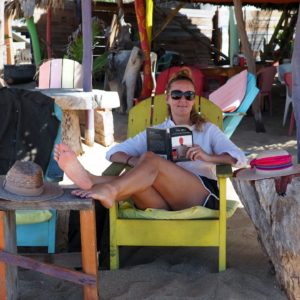 Podnik nie je moc drahý a máme super sedenie na pláži, tak si spravíme nedeľu na pláži a zostaneme až do západu. Pýtame sa obsluhy, kedy bude HH a on, že či chceme teraz. Reku hej. Tak nám donesie dve malé mochitká za 60Pesos. Od predavača kožených kabeliek si K jednu vyberá tak, aby sa do nej zmestil foťák a telefón. Na obed si sadneme za stôl a pochutnáme si na krevetách a rybom filé. Potom sme naspäť pod slnečníkom a čítam si knižku. K vyberá fotky na notebooku. Pláž je pol oblúková, takže z tohto miesta vidíme vlny na opačnom konci zboku. V strede sú skaly a za nimi surfujú traja surferi. Pláž sa medzičasom zaplní a objavia sa polonudisti. V trenkách prídu ku vode, okúpu sa nahí a potom sa zase oblečú a idú sa schovať pred slnkom. Robia to tak aj ľudia v našom podniku. Od dedka s fúrikom si kúpime predražený kokos (35) a on nám nemá vydať 5ku, tak hovorí, že sa vráti, keď bude mať. Do konca pláže to už nerozmenil a potom sa nevrátil.