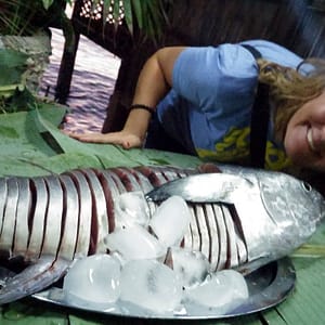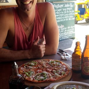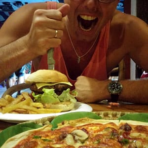 Rully nám donesie 3 cigy. Chceli sme 10 no on zabudol, tak nám dal z jeho zásob. Zo šnorchlovania sme takí hladní, že zase dávame obed v Chilli. Štandardnú Chilli special pizzu a megahambáč so 400g mäsa. Hambáč chodí skôr, no kým príde posrkávame San Mig a pozeráme akomsa z vody ma striedačku vynárajú potápači a korytnačky. Je to super pocit – mať odplávané a vegetiť pri ľadovom pivku čakajúc na jedlo. Kým príde pizza hambáč je zjedený.