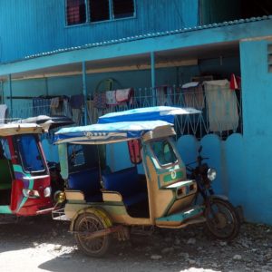 O 11:00 stojíme v tieni protismeru, po hodine a 1 pivku ide prvý bus. Prejdú tri plné, kým konečne sedíme v neklimatizovanom buse za 20 na terminál v Bato. Tam presadneme na práve odchádzajúci bus do Moalboal za 77. Ideme hodinu a pol popri peknom, zľahka rozbúrenom mori. Ostatní belosi povystupujú skôr. V Moalboal ešte navštívime bankomat, lebo na pláži žiaden nie je. Tricykel nás za stovku hodí na pláž, priamo pred hotel, ktorý je ale plný. Dáme pivko v obchodíku a K zmizne na skoro hodku, aby našla izbu. Nenájde, tak idem opačným smerom ja. Aj tam je to všetko plné. Okrem starého hotela vo vnútrozemí nájdem len nový čínsky diveshop – KissDiving, kde majú za tisícku izbu s klímou a sprchu, ale posteľ je dvojposchodová.
