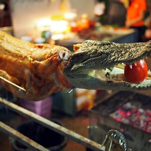 Večer zas vypĺňame romantickými večerami pri prílive ale i menej romantickými večerami kde príde (kvôli zmene) mimo pláže. Raz sa konečne rozhodneme vyskúšať krokodíla, ktorého grilujú celého na veľkom ražni, nakoniec nám ho nedonesú (zabudli), musíme uspokojiť s barakudou a mušľami. Skúšame aj indické menu, ktoré nám veľmi chutí a po tom, čo máme pocit, že nás v našom plážovom podniku obtiahli na výbornom (ale drahom) tuniakovi grilovanom v alobale, chodíme ku Indovi častejšie.