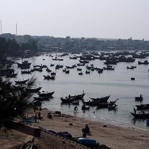 Príchod sledujeme navigáciou a vykladajú nás 1.1km od miesta s mnoho hotelmi. Pýtame sa na lístok do ďalšieho mesta a všimneme si hotel priamo na zastávke. Podľa GPS sme ale takisto ďaleko od mora ako keby sa 1.1km prejdeme paralelne s plážou, pred nami sú na pláži veliké hotely, zajtra by sme zase šlapali 1.1km naspäť na bus, cena za ubytko je fajn ($6) tak zostávame priamo na zastávke. Na štvrtom poschodí. V bočnej uličke za rohom je pizzoška. Majú výbornú pizzu, nie až taký oslnivý burger, mega veľké mojito (30000d) a ovocné víno, ktoré K veľmi chutí. Jediný problém je, že je to celé neslané, tak si pýtame soľ, no do konca jedla žiadna nepríde. Škoda, ale aspoň nám tlak nestúpne. Ani pri účte.