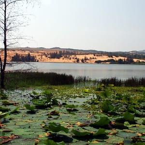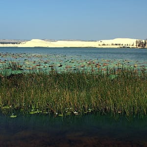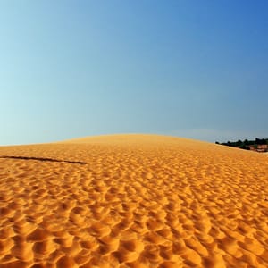 Biele duny vidno uz z diaľky. Jednu ich stranu lemuje podlhovasté jazero. Vyzerá to efekte, keď belasté duny padajú priamo do modrých vôd. Medzi jazerom a príjazdovou cestou sú ešte zelené svahy – polia a záhrady. Zrejme umelo zavlažované z jazera. Pred dunami je parkovisko (moped za 5000d) a platíme vstupné (10 000d každý). Prejdeme ihličnatými hájmi, ktoré tienia stánky s občestvením a po odrieknutí pár ponúk na štovrkolky, bobovanie po dunách a jazdu na pštrosovi sme konečne na dunách. Je to pekné, no duny nevyzerajú byť až také veľké a sú dosť rozjazdené a poničené od štvorkoliek. Taktiež ma rozčuluje, koľko šlapiek (kto preboha stratí šlapky na dunách), zostatkov z linolea so šnúrkami na spúšťanie sa z dún a odpadkov ako takých je na dunách. Keď už za to vyberajú vstupné a toľko typanov tam jazdí na tých množstvách štvorkoliek, tak by to mohli mať trochu čistejšie. Možno nechať aj nejaké dni, nech sa duny trochu spamätajú. Je riadny výpek. Teplo je suché a máme dlhé rukávy a klobúky, tak to ako tak zvládame. Pobeháme trochu po dunách, niečo pofotíme a ideme sa schovať do tieňa. S pekným výhľadom na duny konzumujeme prinesené ovocie. Posilníme sa ešte polievkou a vyrážame naspäť. Čakajú nás ešte červené duny.