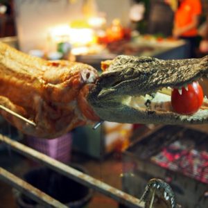 Večer zas vypĺňame romantickými večerami pri prílive ale i menej romantickými večerami kde príde (kvôli zmene) mimo pláže. Raz sa konečne rozhodneme vyskúšať krokodíla, ktorého grilujú celého na veľkom ražni, nakoniec nám ho nedonesú (zabudli), musíme uspokojiť s barakudou a mušľami. Skúšame aj indické menu, ktoré nám veľmi chutí a po tom, čo máme pocit, že nás v našom plážovom podniku obtiahli na výbornom (ale drahom) tuniakovi grilovanom v alobale, chodíme ku Indovi častejšie.