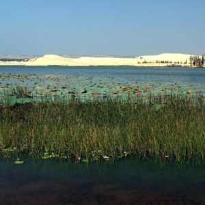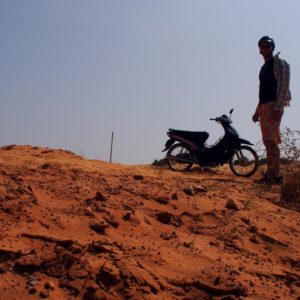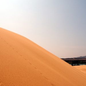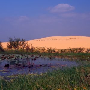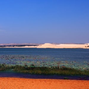 Biele duny vidno uz z diaľky. Jednu ich stranu lemuje podlhovasté jazero. Vyzerá to efekte, keď belasté duny padajú priamo do modrých vôd. Medzi jazerom a príjazdovou cestou sú ešte zelené svahy – polia a záhrady. Zrejme umelo zavlažované z jazera. Pred dunami je parkovisko (moped za 5000d) a platíme vstupné (10 000d každý). Prejdeme ihličnatými hájmi, ktoré tienia stánky s občestvením a po odrieknutí pár ponúk na štovrkolky, bobovanie po dunách a jazdu na pštrosovi sme konečne na dunách. Je to pekné, no duny nevyzerajú byť až také veľké a sú dosť rozjazdené a poničené od štvorkoliek. Taktiež ma rozčuluje, koľko šlapiek (kto preboha stratí šlapky na dunách), zostatkov z linolea so šnúrkami na spúšťanie sa z dún a odpadkov ako takých je na dunách. Keď už za to vyberajú vstupné a toľko typanov tam jazdí na tých množstvách štvorkoliek, tak by to mohli mať trochu čistejšie. Možno nechať aj nejaké dni, nech sa duny trochu spamätajú. Je riadny výpek. Teplo je suché a máme dlhé rukávy a klobúky, tak to ako tak zvládame. Pobeháme trochu po dunách, niečo pofotíme a ideme sa schovať do tieňa. S pekným výhľadom na duny konzumujeme prinesené ovocie. Posilníme sa ešte polievkou a vyrážame naspäť. Čakajú nás ešte červené duny.