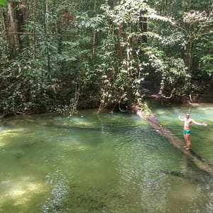 Ostatné člny sa vracajú späť, lebo majú odlety a iné exkurzie. My ešte dostaneme 20 minút na kúpanie sa v priezračnej vode pod jaskyňou. Košičania mali v cene hotelového zájazdu aj obed v piknikovom priestore nad jazierkom. Niektoré skupiny majú kvalitne vyzerajúci katering z veľkých antikorových tácni s poklopom.