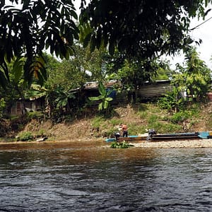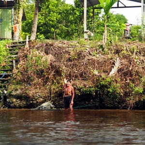 Ráno sa budíme na bludných Nemcov – susedov odvedľa, čo zrejme idú na prechádzku v korunách stromov. To je to najskoršie, čo existuje. Nie sme nadšení, no snažíme sa dospať, čo sa dá. Náš výlet začína až 8:45. Spravíme si čierny čaj, zajeme krekry, poprajeme domácemu deduškovi ŠNR a poďho na loďku. Ideme tri člny. V našom najmenšom člnku sme piati vrátane perfektne hovoriacej sprievodkyne – polovičnej Írke. Potom je tam ešte kapitán vzadu pri motore a vpredy mladý s vesielkom robí dodatočný pohon na plytčinách. Ideme proti prúdu rieky, je ešte príjemne chladno a všetko je tak slávnostne ospalé. Tu nám máva deduško v kroji, inde ľudia perú a deti sa kúpu. Je príjemná slávnostná a relaxujúca atmosféra. Ešte aj svetlo a okolie rieky je malebné.