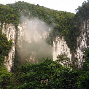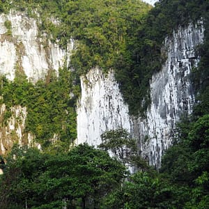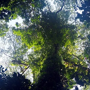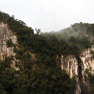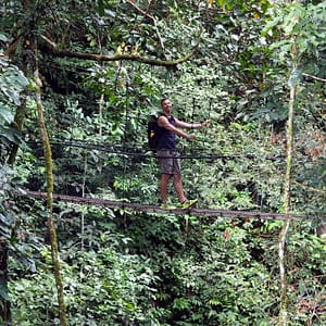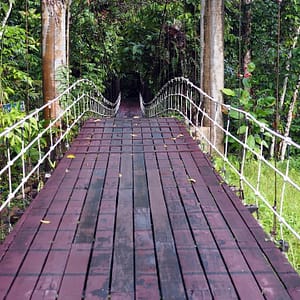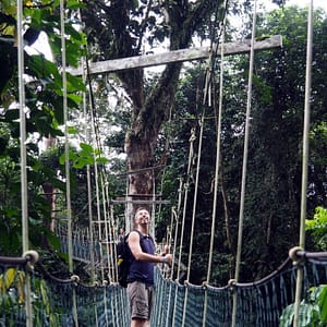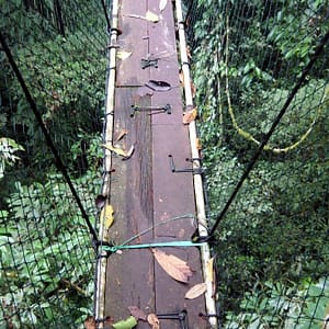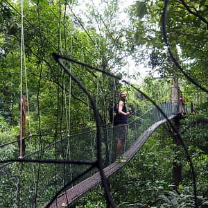 Silvestrovský ranný Canopy Walk v dažďovom pralese sa nesie v pokľudnom duchu. Vstali sme a cválali do parku, lebo 07:00 sa vyráža do korún stromov. Po asi 20 minútach odbočíme z cesty do Jelenej jaskyne, ktorú už dôverne poznáme, a po pár minútach sme pod búdkou, z ktorej začína visiaci mostík v korunách o dĺžke 450 metrov vo výške 40-50m, že vraj najdlhší na svete. Vrátane sprievodcu sme siedmi. Podľa inštrukcií môžeme byť maximálne dvaja na úseku medzi stromami. Indický párik pred nami sa stále fotí, ale celkom to aj chápeme, mladomanželka má tmavú pokožku a skoro vôbec ju nie je vidno, tak treba nacvakať čo sa dá. Mostíky sa kľukatia ponad rieku, zoznamujeme sa s rôznymi typmi stromových gigantov. Mne sa na viacerých miestach zdá výška ochranného pletiva neadekvátna, ale hodinka pól ujde ako voda pod nami. Zvieratá, ak nejaké boli, tak tie videli nás a nie my ich.