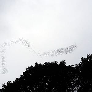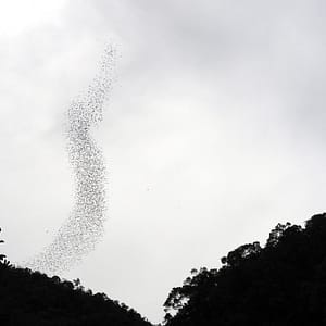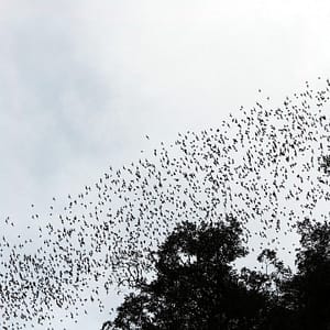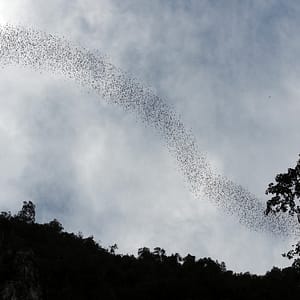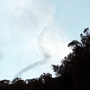 Keď netopiere konečne začnú vyletovať, je to nad všetky očakávania. Vyletujú v skupinách, ktoré vyzerajú ako krútiaci sa had, alebo dážďovka. Keď letia ponad nás, počuť aj ich let, ako keď zaveje vietor v hore a zašumí lístím, alebo roj múch. Fotíme a točíme spolu s ostatnými turistami, ktorí aspoň na zlomok sekundy stíchli od údivu.