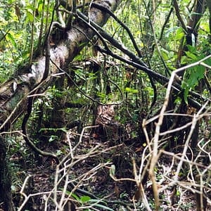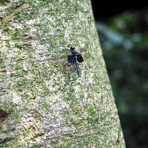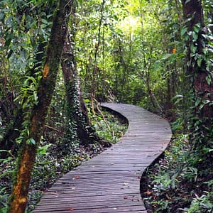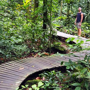 Po potrebnej sprche ideme do parku, kde zaplatíme vstup na 5 dní (30R), zaregistrujeme sa na zajtrajšie platené túry a vyberieme sa na self guided túru – botanický okruh. Dažďový prales je pekne vlhký a i keď sa zo začiatku zdá príjemne chladivý, po pár minútam sa potíme o 106. So slzou v oku si spomíname na turistiky v miernom pásme, kde sa dá potenie predsa len lepšie regulovať. Okrem rôznorodej vegetácie vidíme aj nejaké tie motýle, lokálnu mikro veveričku, ktorá pobehne kúsok so vztýčeným chvostom, potom ho zaklopí, poobezerá sa, vztýči a fičí ďalej. K vidí aj pekného vtáka, ale kým tam dobehnem, už je vtáčik preč. Vyberieme sa aj na vyhliadkovú vežu, ale tam okrem hnusného tepla nič nevidíme. Väčšinou chodíme po doskovom mostíku so zábradlím asi 30 cm nad povrchom zeme. Ten je miestamy suchý, miestami bačorinový.