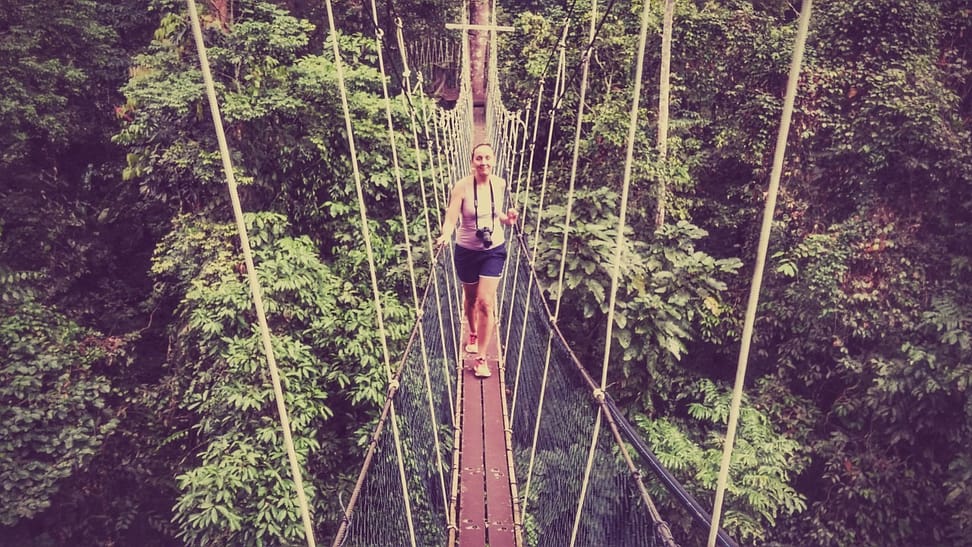 Silvestrovský ranný Canopy Walk v dažďovom pralese sa nesie v pokľudnom duchu. Vstali sme a cválali do parku, lebo 07:00 sa vyráža do korún stromov. Po asi 20 minútach odbočíme z cesty do Jelenej jaskyne, ktorú už dôverne poznáme, a po pár minútach sme pod búdkou, z ktorej začína visiaci mostík v korunách o dĺžke 450 metrov vo výške 40-50m, že vraj najdlhší na svete. Vrátane sprievodcu sme siedmi. Podľa inštrukcií môžeme byť maximálne dvaja na úseku medzi stromami. Indický párik pred nami sa stále fotí, ale celkom to aj chápeme, mladomanželka má tmavú pokožku a skoro vôbec ju nie je vidno, tak treba nacvakať čo sa dá. Mostíky sa kľukatia ponad rieku, zoznamujeme sa s rôznymi typmi stromových gigantov. Mne sa na viacerých miestach zdá výška ochranného pletiva neadekvátna, ale hodinka pól ujde ako voda pod nami. Zvieratá, ak nejaké boli, tak tie videli nás a nie my ich.